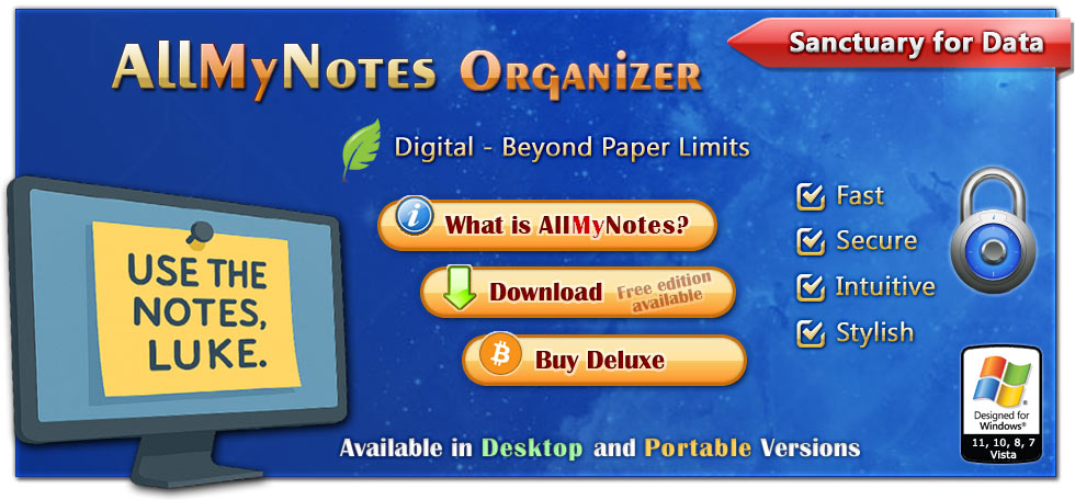We have free (Lite) and paid (Deluxe) versions of AllMyNotes Organizer. Whatever which edition you pick, you can trust that it will faithfully store your private details, let you instantly access it. Unlike other subscription-based programs, we never charge recurring fees. Our philosophy is simple - everyone should have access to a quality app, irrespective of their budget. Even our free (Lite) edition is feature-rich. Paid version has a affordable price. We have no hidden motives. Once you purchase the product, it never expires, and we never pressure our customers to renew their license, only very distant, major upgrades, may cost to upgrade, but still remain optional. It's yours!